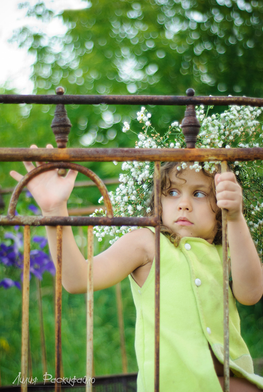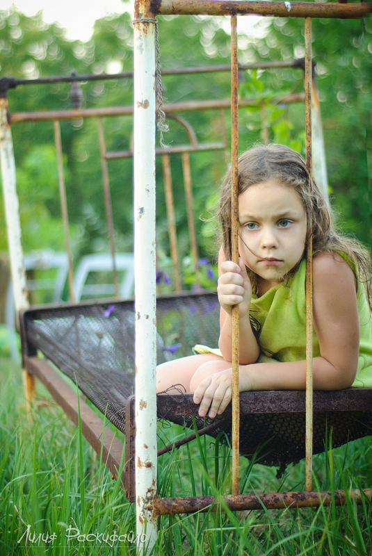 Каждые выходные ездим семьёй на дачу, детей рядом на дачах почти нет и Настюня к вечеру начинает скучть и я попыталась совместить (показать) в фотографиях Настюшино настроение и кровать которая на даче ржавая стоит. Буду рада Вашим замечаниям и критике.