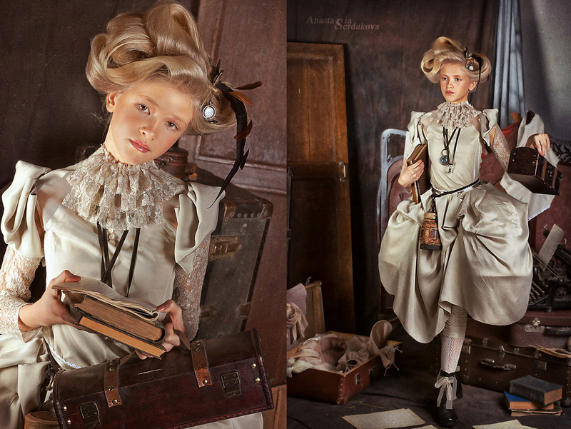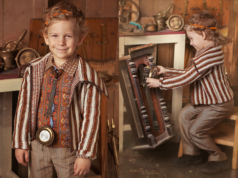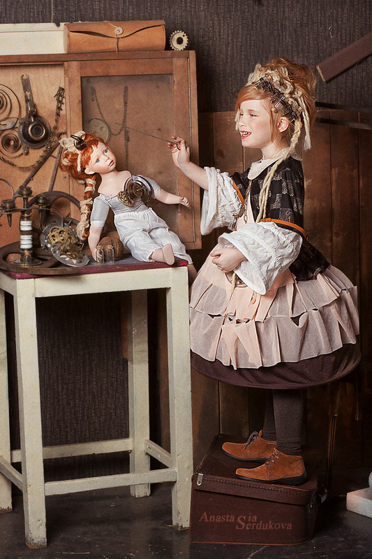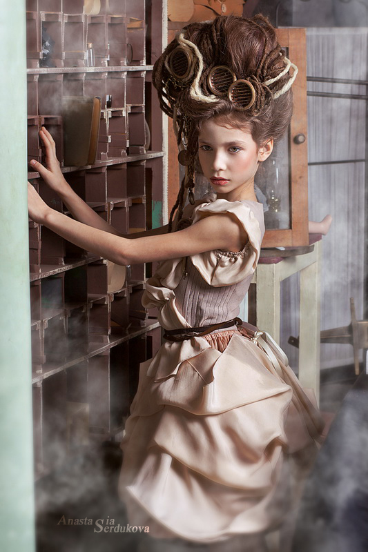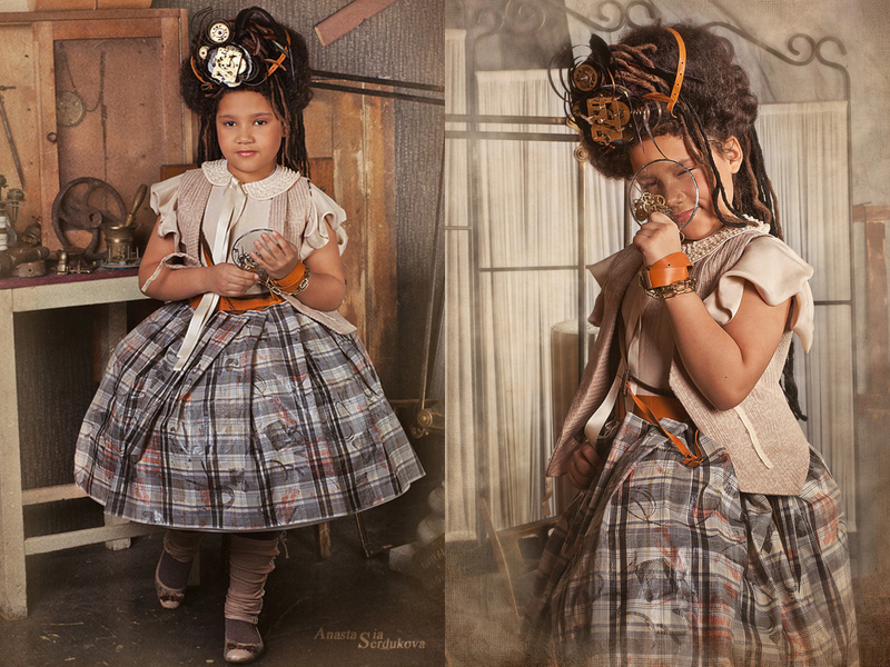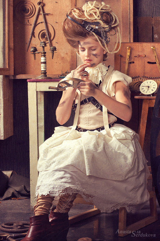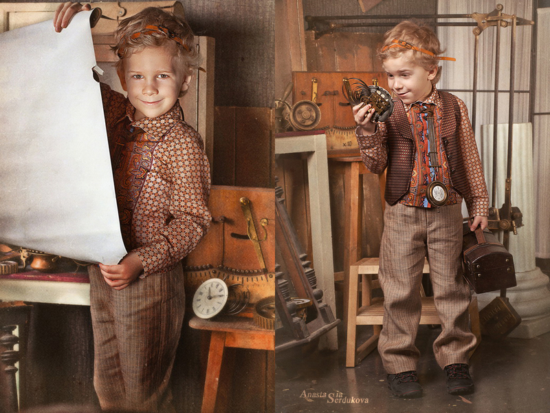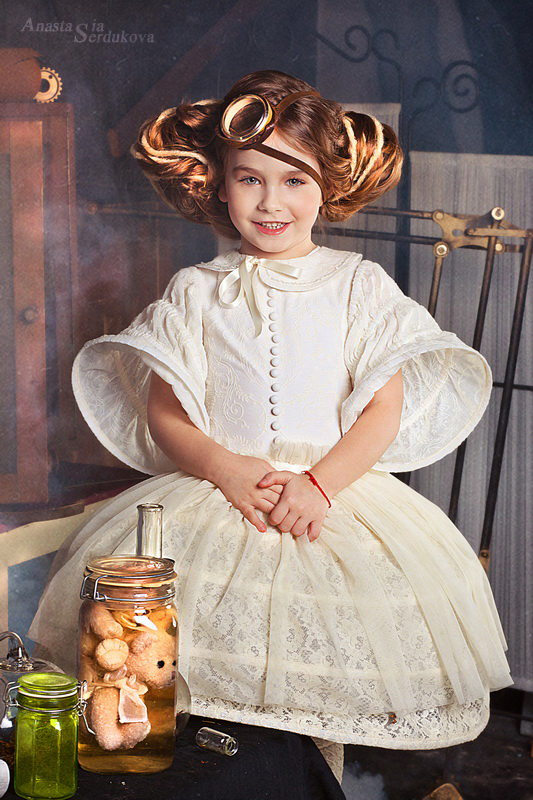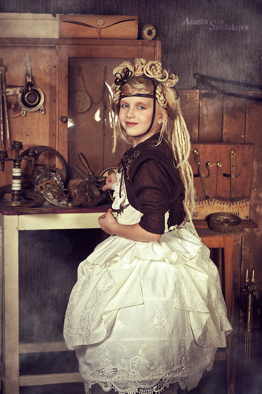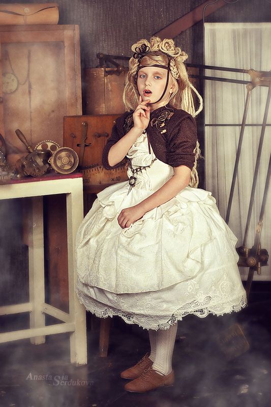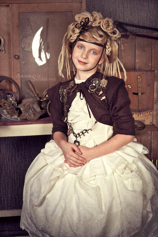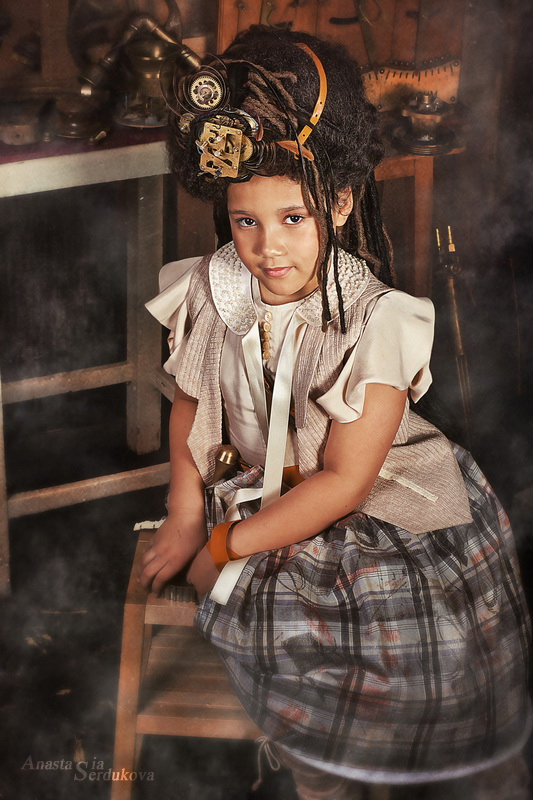 Мои волшебники: Модельер Зоя Гордеева Стиль и декорации Инна Спиридонова Отдельное спасибо за помощь в организации съемок и гостеприимство студии "Inspirata" и лично Виталию Гуляеву. И конечно же нашим потрясающим деткам, талантливым и артистичным) P.S. Стимпа?нк (или паропа?нк) — направление научной фантастики, моделирующее цивилизацию, в совершенстве освоившую механику и технологии паровых машин. Как правило, стимпанк подразумевает альтернативный вариант развития человечества с выраженной общей стилизацией под эпоху викторианской Англии (вторая половина XIX века) и эпоху раннего капитализма с характерным городским пейзажем и контрастным социальным расслоением. Возможно, однако, и наличие в произведениях стимпанка большей или меньшей доли элементов фэнтези. (буду рассказывать постепенно и в конце даже покажу вам небольшой бекстейджик)