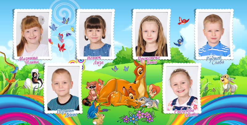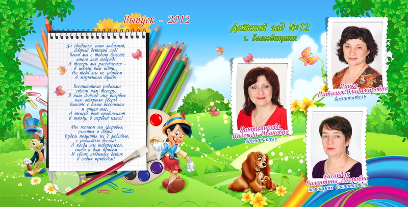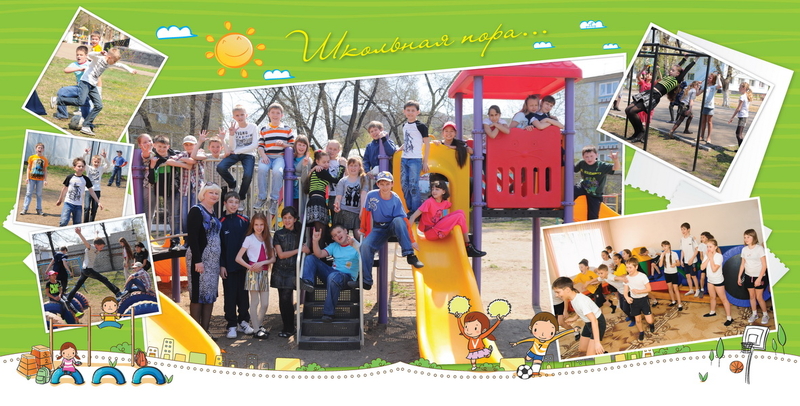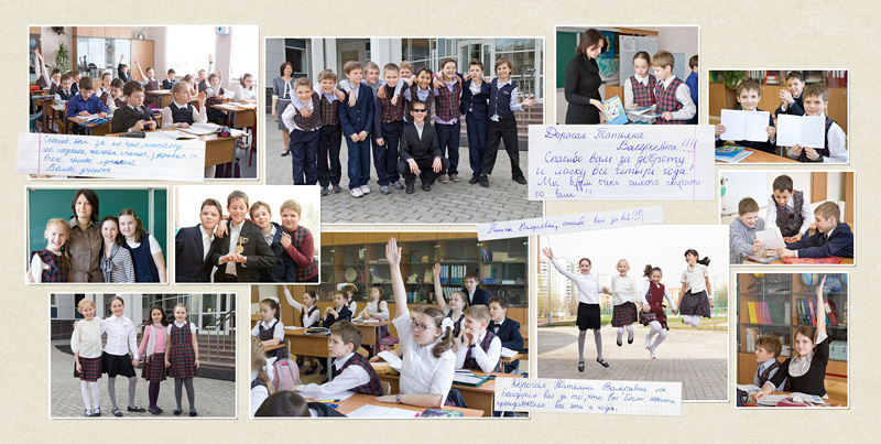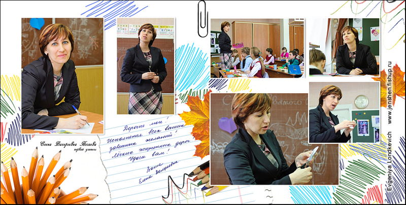 1-й разворот - виньетка, группа и пожелание учителя. 2-5 развороты - коллажи.