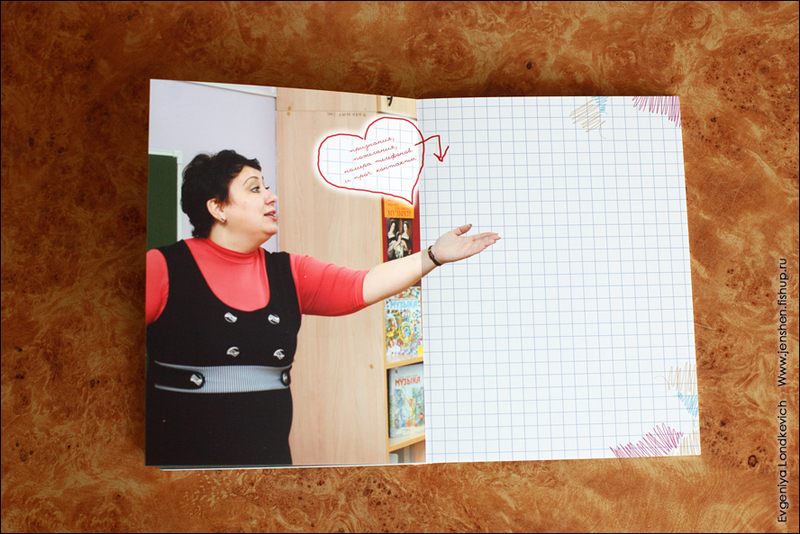 Кстати, делая книгу для учителя, я оставила пустые листы для того, чтобы выпускники могли оставить там пожелания, благодарности, контакты и проч., типа такого: