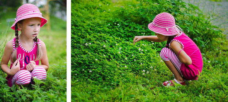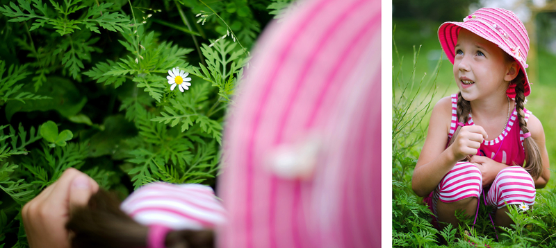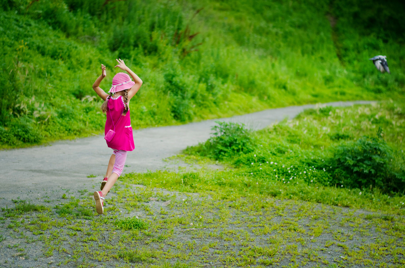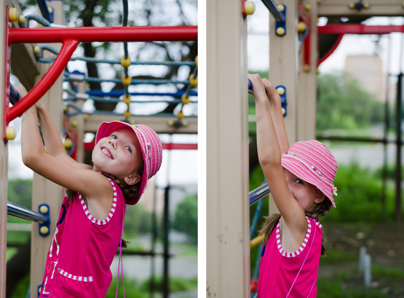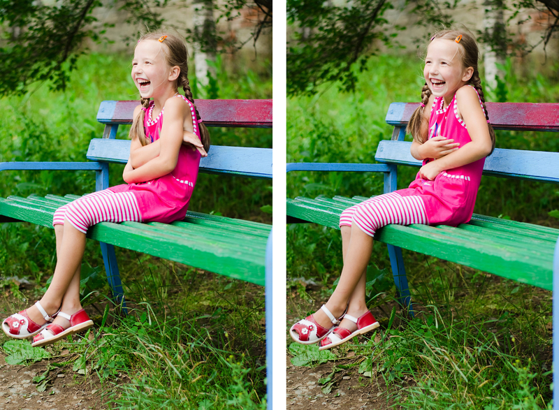 Один конкретный пример. Кадр 1, правый снимок. Берем ту же девочку, ту же погоду. Ставим девочку не в сорняки, а на дорожку, справа-слева деревья какие-нибудь. Снимаем широкий горизонтальный кадр на сильно открытой диафрагме. Вуаля, другой кадр.