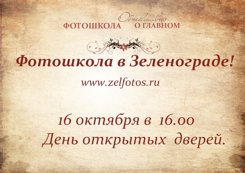 Мы рады сообщить вам об открытии фотошколы нашего сообщества! Приглашаем всех, кто уже заходил к нам в гости на различные мероприятия, выставки и мастер-классы. И тех, кто только хочет с нами познакомиться. Теперь у нас будет удобное и уютное место для фотошколы. Это недавно открывшаяся в городе хорошая интерьерная фотостудия "Солнечный луч". У нас вы сможете услышать различные курсы по фотографии. Встретить полюбившихся вам фотографов. Заказать семейную или детскую фотосъёмку. Так же у нас планируется он-лайн обучение для тех, кто не может присутствовать на занятиях) так что, если вы не можете к нам приехать - пишите мне в личку какой курс вам интересен в режиме он-лайн) Хотим пригласить вас на день открытых дверей в нашей фотошколе!!! 16 октября в 16.00 Фотошкола «ОБЪЕКТИВно о главном» в Зеленограде приглашает всех на "День открытых дверей"! В программе дня: Знакомство с фотостудией. Встреча и знакомство с нашими преподавателями, возможность задать им любые вопросы, показать свои работы и услышать рекомендации профессионалов. Время: 16 октября в 16 часов. Адрес: Андреевка, ул. Жилинская, д.3, территория НПО "Стеклопластик"), фотостудия <<Солнечный луч>> Вход свободный! Для того чтобы мы могли встретить вас в максимально комфортной обстановке рекомендуется предварительная запись. Записаться можно по почте «email» (нажать для отображения), по телефону 8-916-2475457 Все фотоматериалы опубликованные на сайте имеют своего автора. Использование фотографий без разрешения автора запрещено.