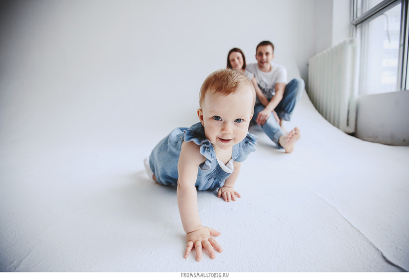 Очень любим белую циклораму , она как белый лист бумаги - рисуй, что хочешь! Рисовали вместе с Машей и ее родителями Аней и Максом. Общим составом с удовольствием ползали из угла в угол, случалось даже, что перебрались на потолок..