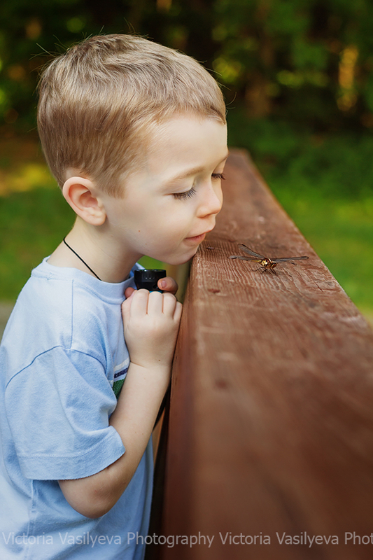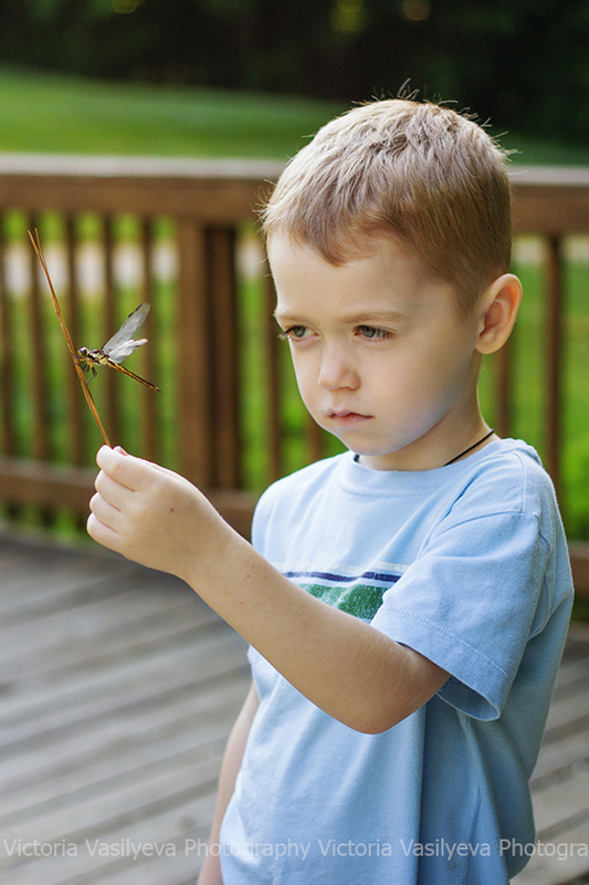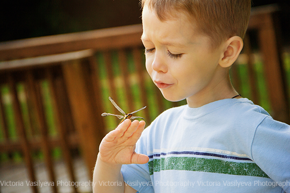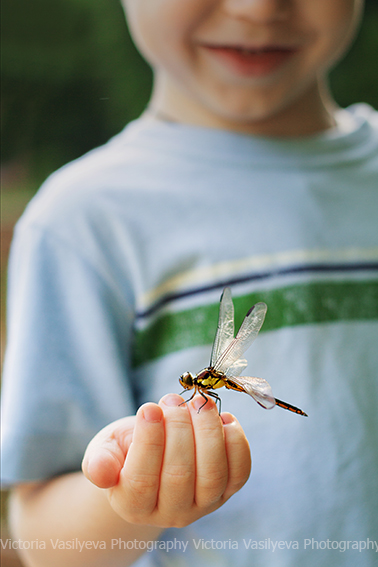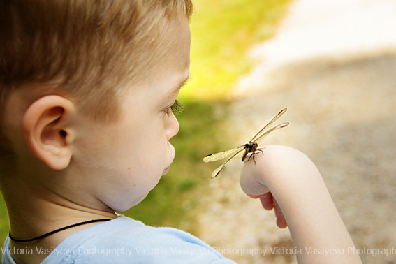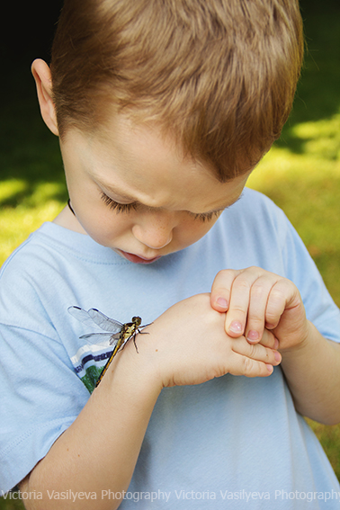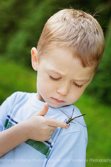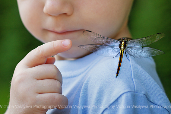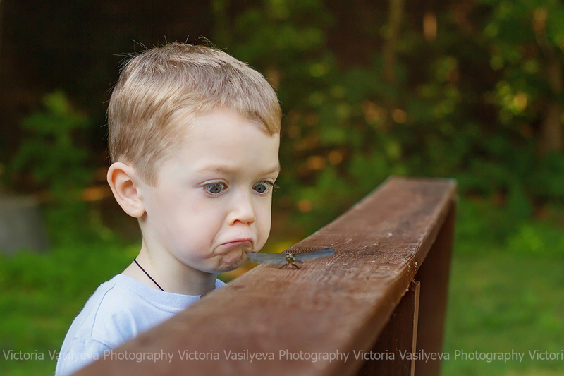 Все бывает в жизни в первый раз ) Вот и Сева первый раз лицом к лицу столкнулся с мирно сидевшей на мостике стрекозой. Его эмоции говорят сами за себя ) Сначала было страшно, но он пересилил страх, 100 раз переспросив, не укусит ли она его ) а потом и вовсе не хотел с ней расставаться )