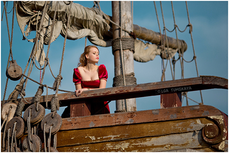 в эмоциональном плане все достаточно однообразно, чтобы еще что-то добавлять, вот скупа моя девушка на эмоции, напускает на себя эдакую "маску", а ведь у нее обалденная ямочка на щеке при улыбке! Ну и то, что параллельно получилось две съемки при ограниченном времени (не рассчитали время, уже ближе к вечеру приехали) - тоже наложило отпечаток на однообразность. На корабле можно было бы добавить - но там надо менять фон (лес) на что-то драматично-айвазовское :)