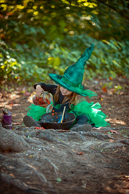 Фотосъёмка готовилась ко дню празднования Хэллоуина. Интересный факт в том, что девочку на самом деле зовут Сабриной) Мы бегали по волшебному саду, залазили на американскую сосну и варили зелье от печалей. Вот что получилось)