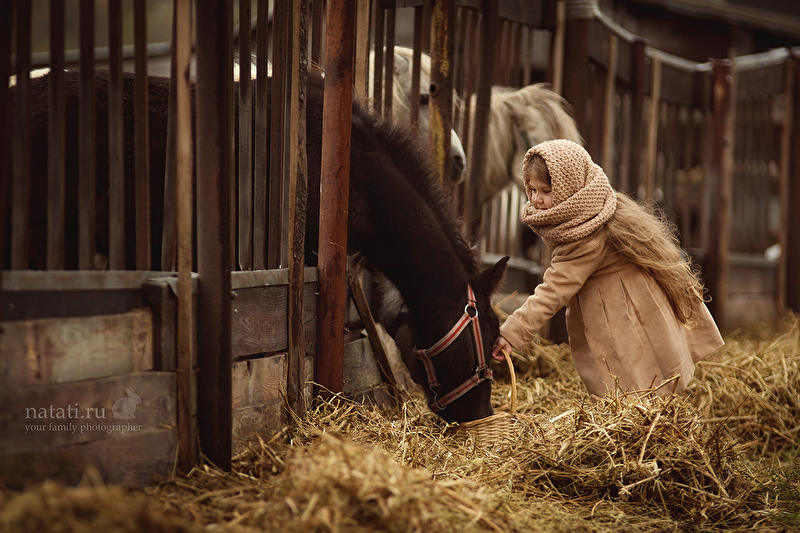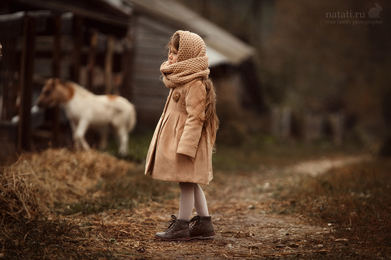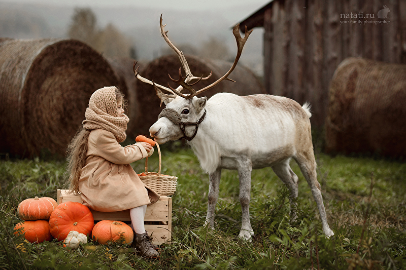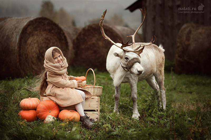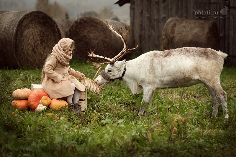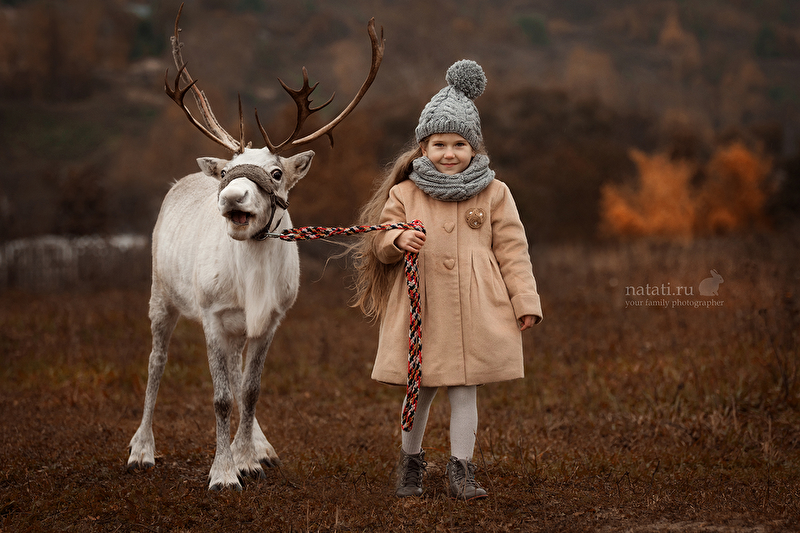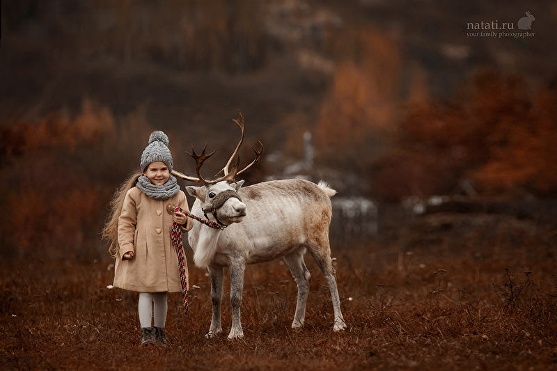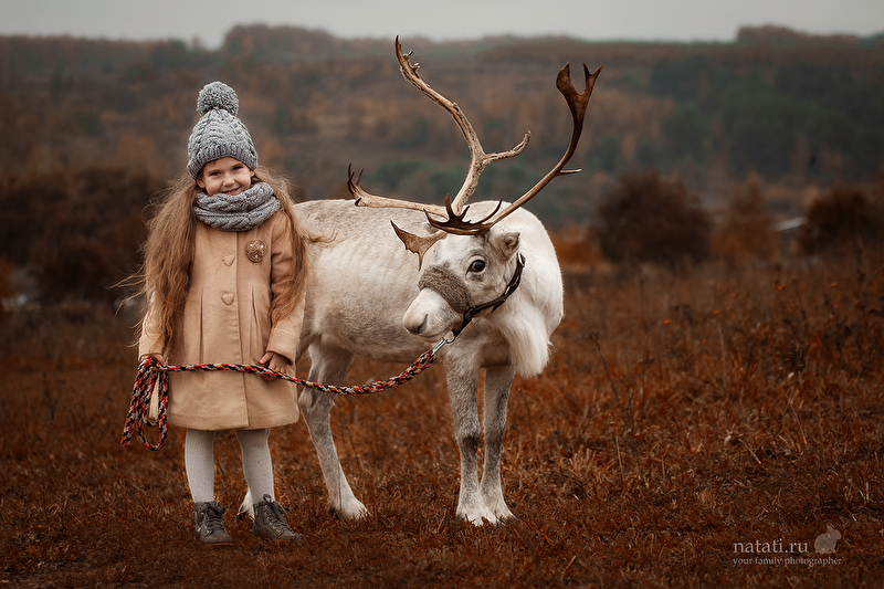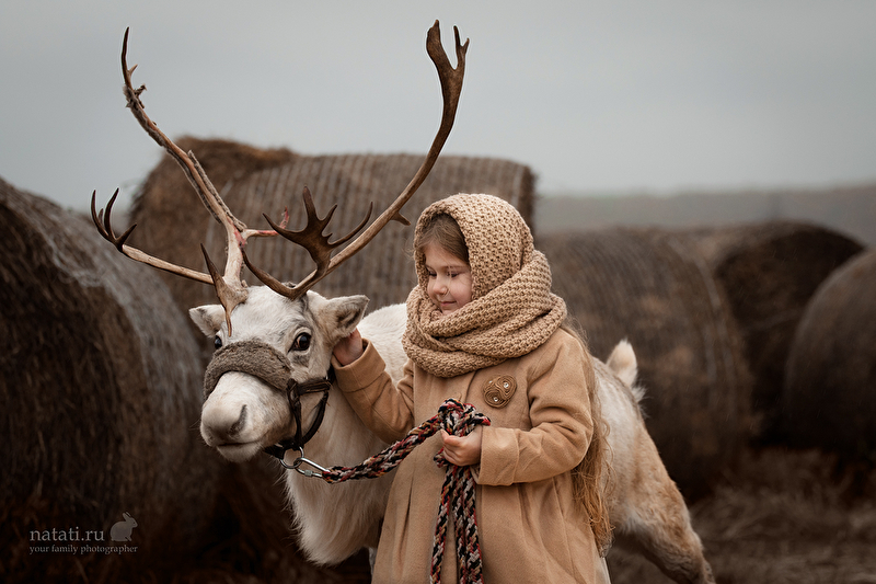 Съемка была еще в конце сентября, но уже тогда было очень холодно, дул пронизывающий ветер, шел мелкий моросящий дождик, а олень опасно махал рогами. Маше было все ни по чем) Когда мы приехали на место съемки, я не верила, что что-то получится, а получилась целая серия) Быстро обрабатывать не хотелось, смаковала каждый кадр, что-то меняла не по одному разу. До сих пор не уверенна, насколько целостной выглядит обработка, но решила, что это уже конечный результат)