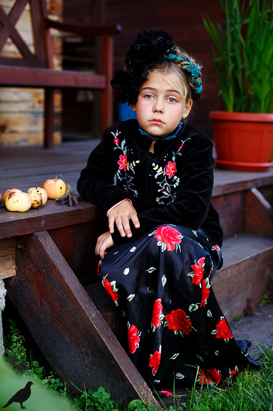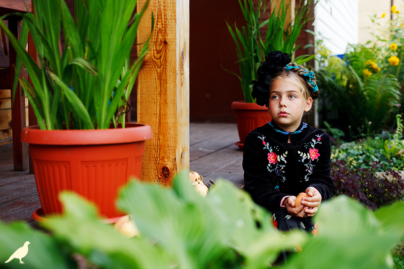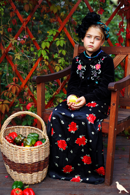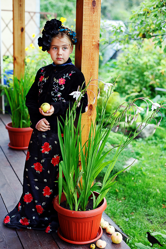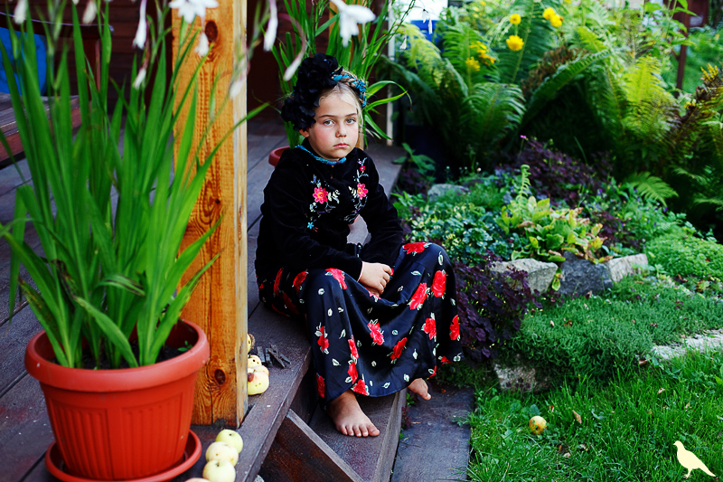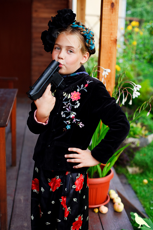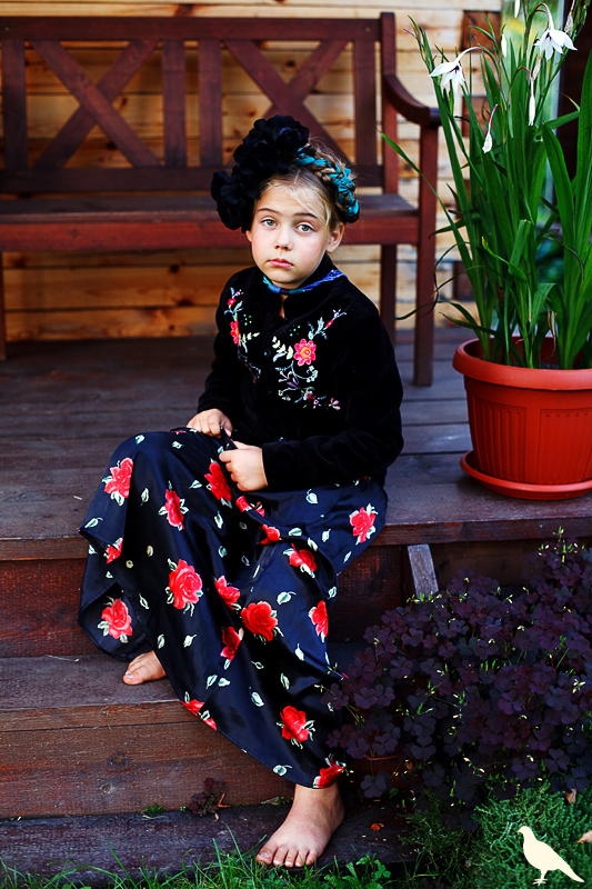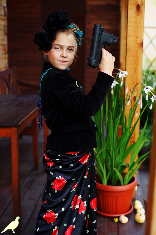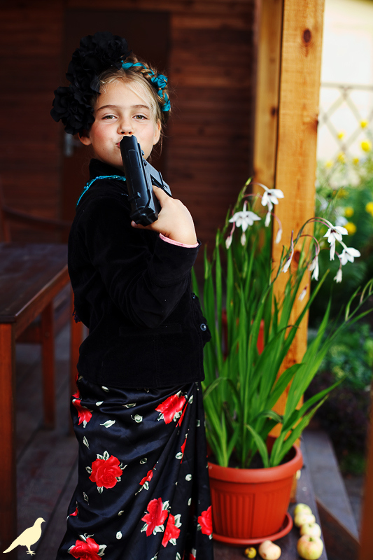 Началась эта игра два года назад, тогда мы со старшей дочкой нарядили её в любимую мной Фриду Кало, было несколько фотографий(сняла как умела тогда :) , но нам понравилось). С тех пор я всё хотела повторить, да как-то не доходило до этого. И вот мы повторили! Получилось не так, как представляла себе-дочка отвлекалась на внезапно приехавшую подружку и сестру, ей было жарко в бархате и цветах, но спас соседский участок, который в моём представлении очень даже мексиканский по колориту :) Съёмка длилась не больше получаса, где-то в середине она даже всплакнула по какому-то поводу, мать-ехидна, разумеется, и это запечатлела("Фрида Кало и невидимые миру слёзы" :) ) В конце она нашла какой-то разломанный автомат :)) и получилась у нас экспромтом Фрида, мстящая за Троцкого :)
