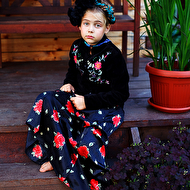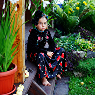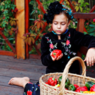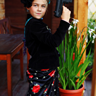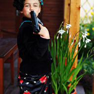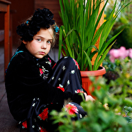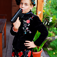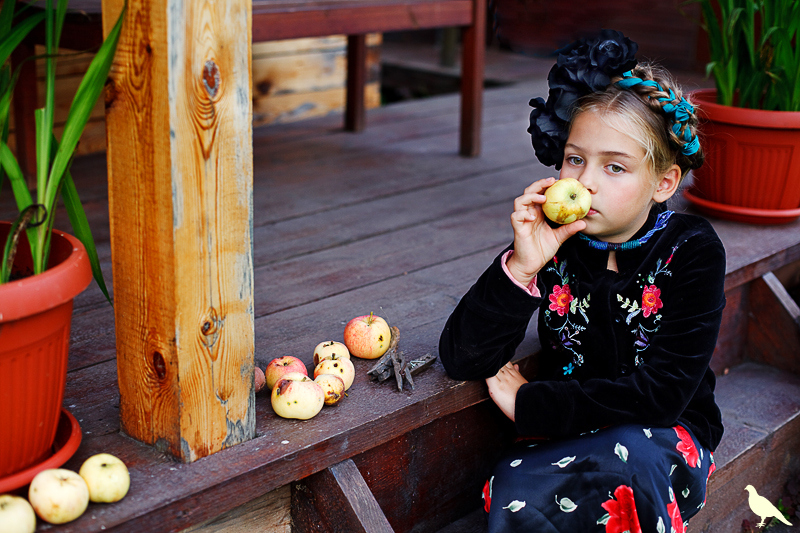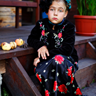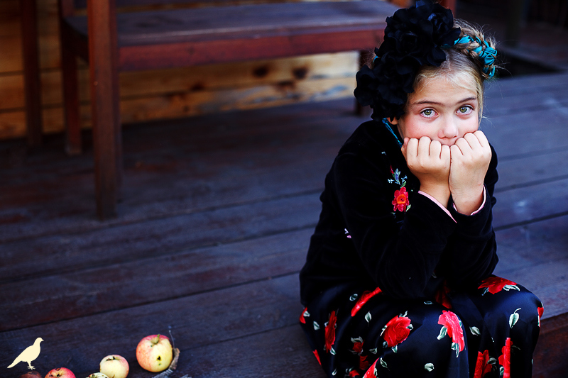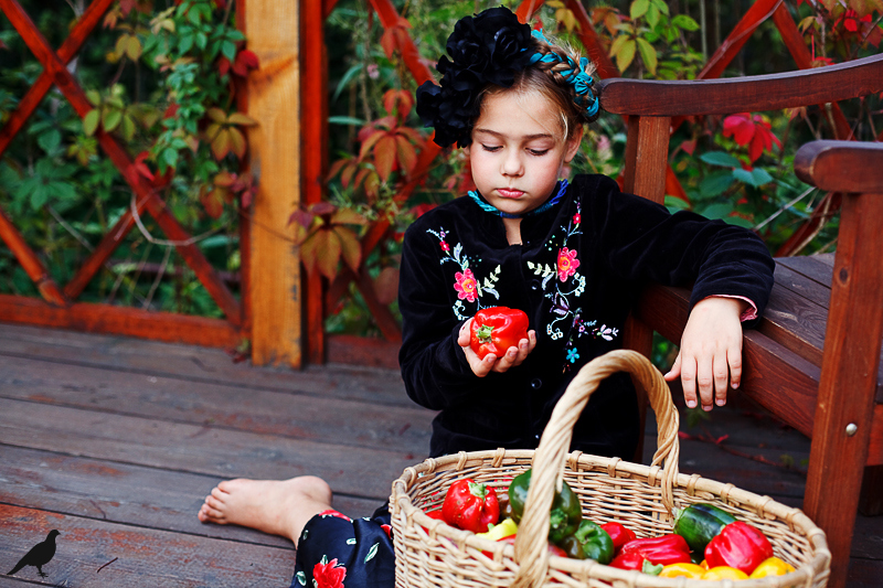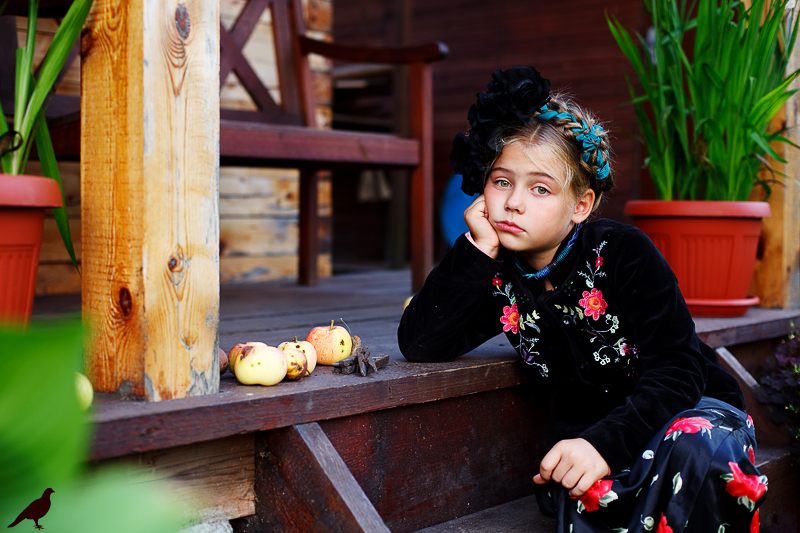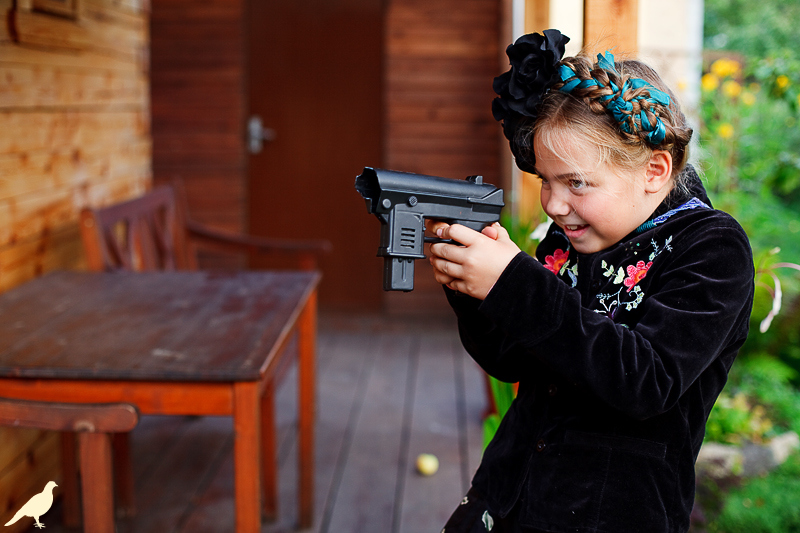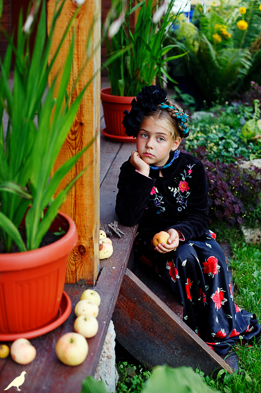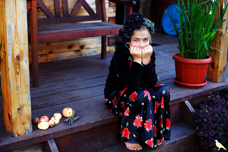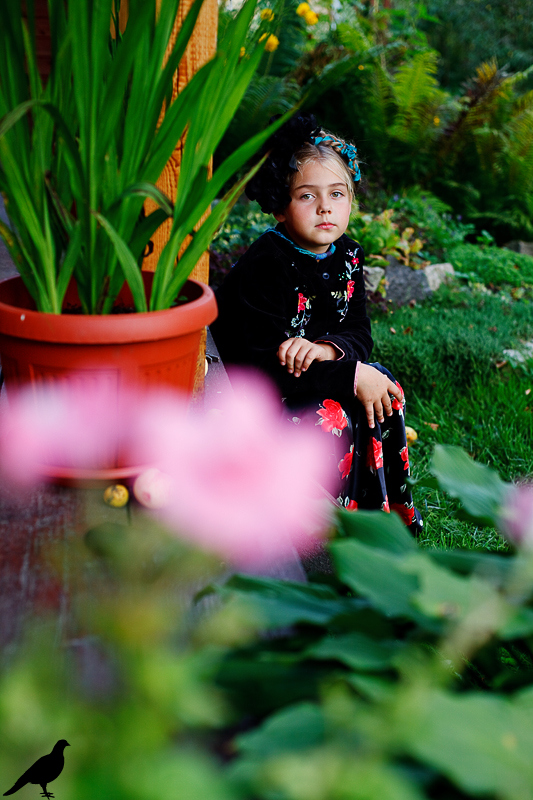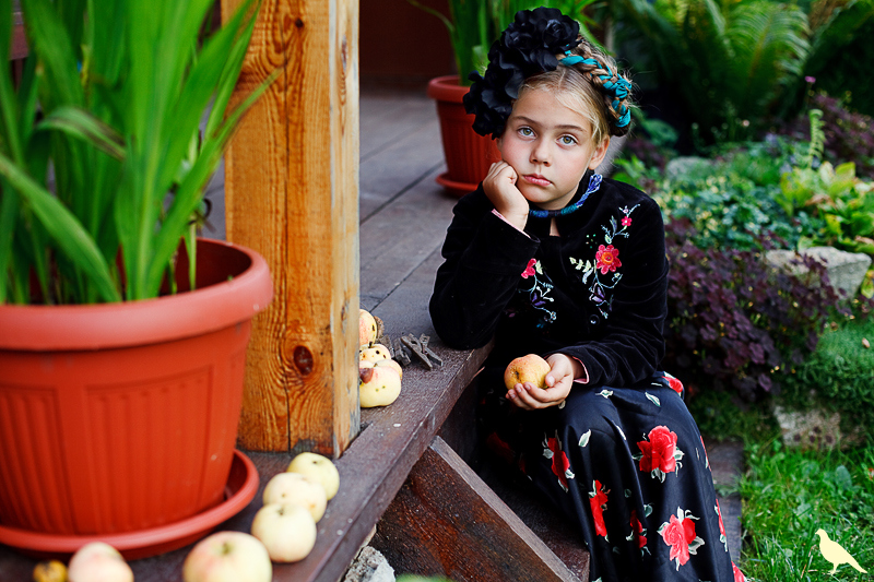 Началась эта игра два года назад, тогда мы со старшей дочкой нарядили её в любимую мной Фриду Кало, было несколько фотографий(сняла как умела тогда :) , но нам понравилось). С тех пор я всё хотела повторить, да как-то не доходило до этого. И вот мы повторили! Получилось не так, как представляла себе-дочка отвлекалась на внезапно приехавшую подружку и сестру, ей было жарко в бархате и цветах, но спас соседский участок, который в моём представлении очень даже мексиканский по колориту :) Съёмка длилась не больше получаса, где-то в середине она даже всплакнула по какому-то поводу, мать-ехидна, разумеется, и это запечатлела("Фрида Кало и невидимые миру слёзы" :) ) В конце она нашла какой-то разломанный автомат :)) и получилась у нас экспромтом Фрида, мстящая за Троцкого :)