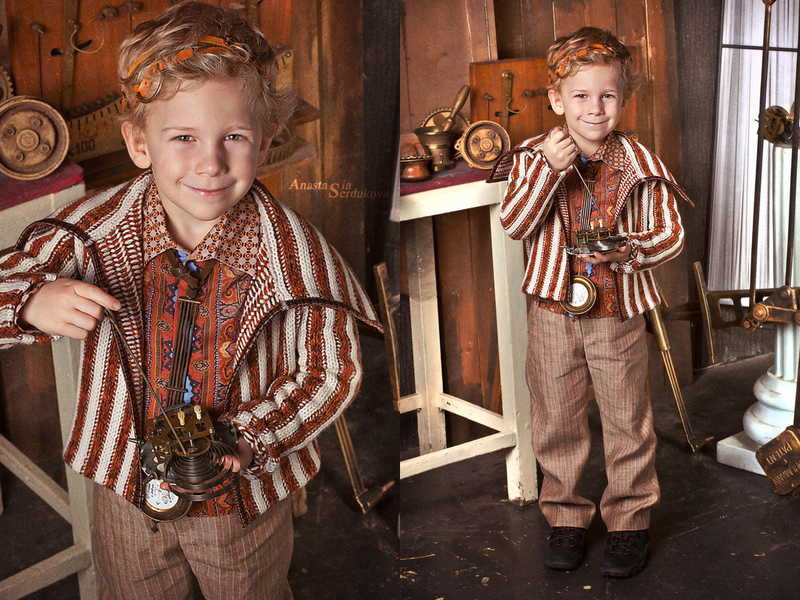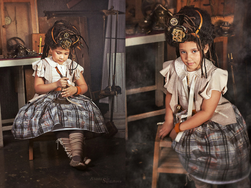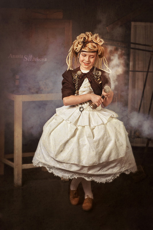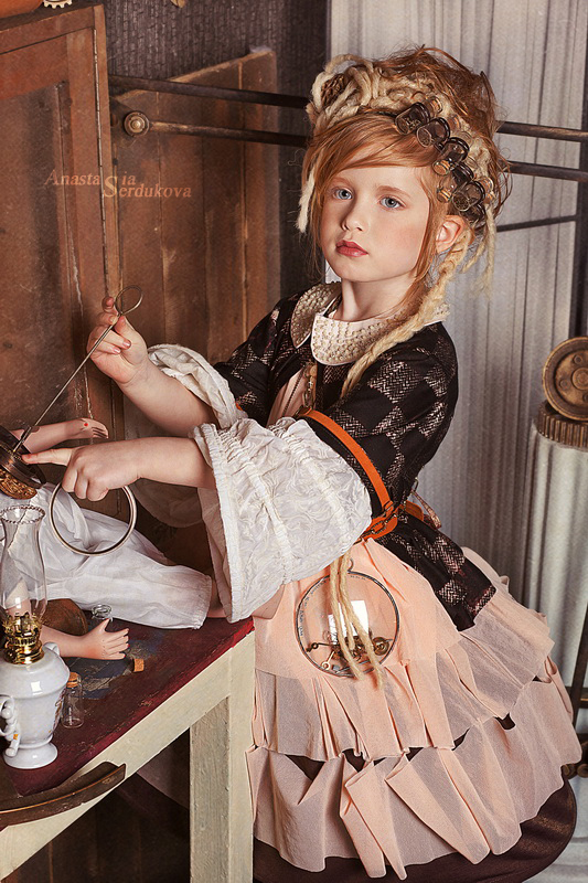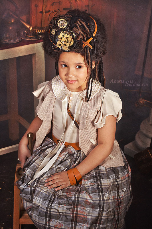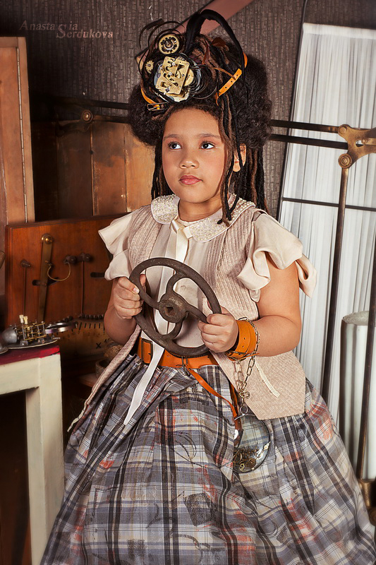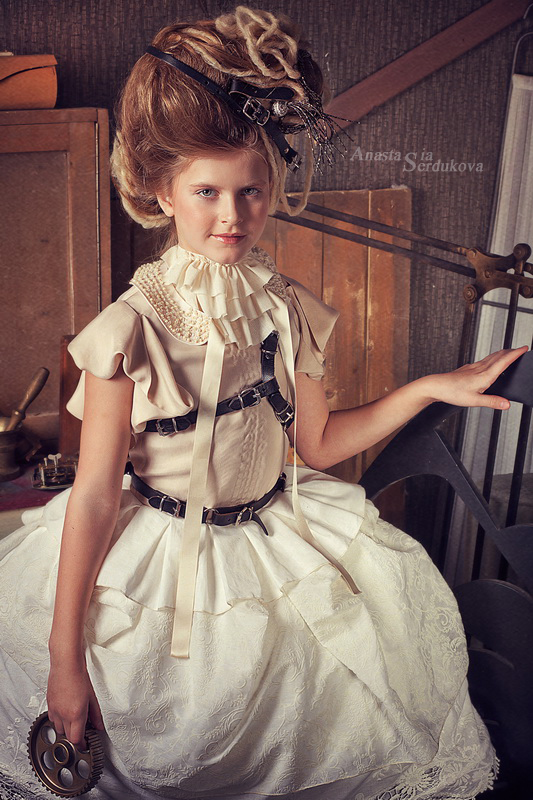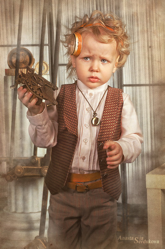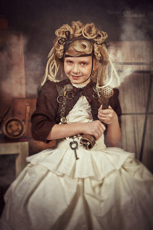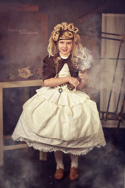 Мои волшебники: Модельер Зоя Гордеева Стиль и декорации Инна Спиридонова Отдельное спасибо за помощь в организации съемок и гостеприимство студии "Inspirata" и лично Виталию Гуляеву. И конечно же нашим потрясающим деткам, талантливым и артистичным) P.S. Стимпа?нк (или паропа?нк) — направление научной фантастики, моделирующее цивилизацию, в совершенстве освоившую механику и технологии паровых машин. Как правило, стимпанк подразумевает альтернативный вариант развития человечества с выраженной общей стилизацией под эпоху викторианской Англии (вторая половина XIX века) и эпоху раннего капитализма с характерным городским пейзажем и контрастным социальным расслоением. Возможно, однако, и наличие в произведениях стимпанка большей или меньшей доли элементов фэнтези. (буду рассказывать постепенно и в конце даже покажу вам небольшой бекстейджик)