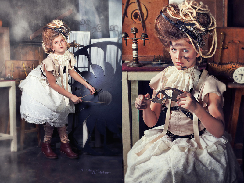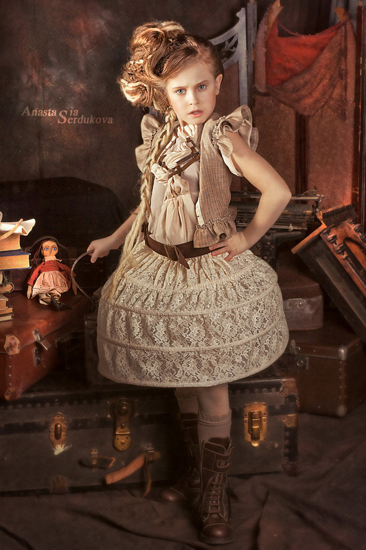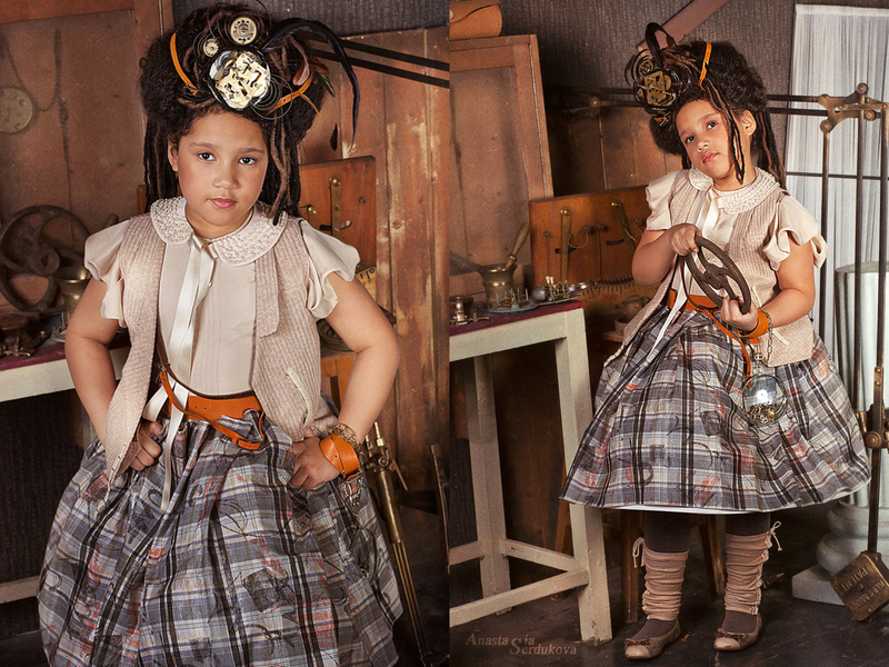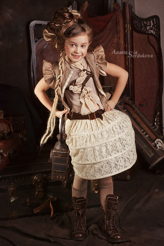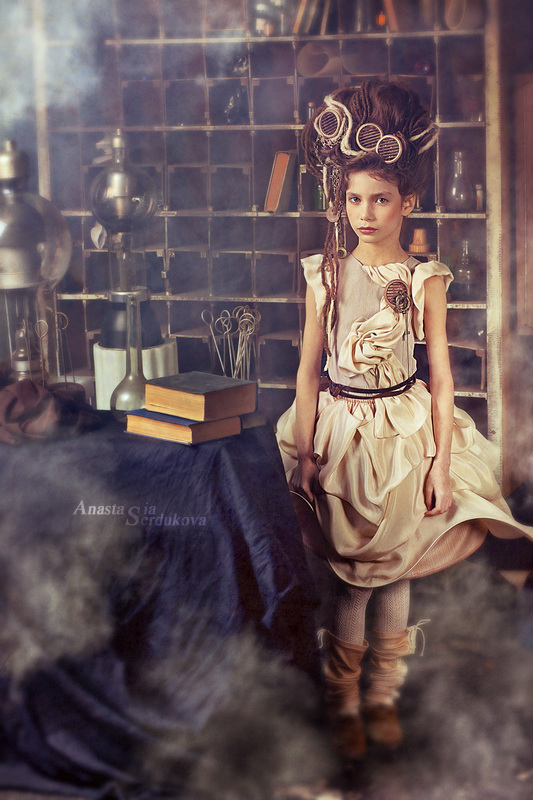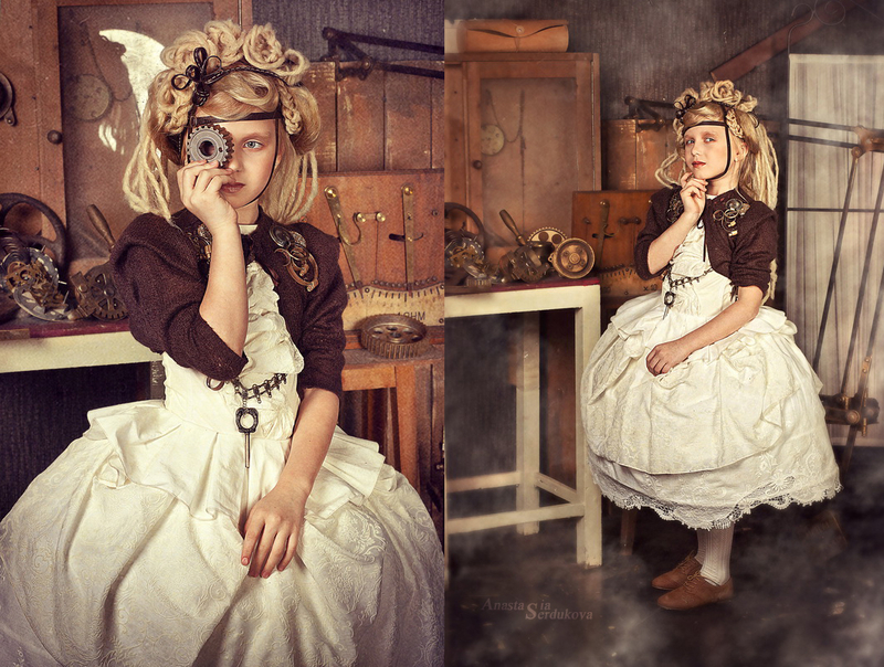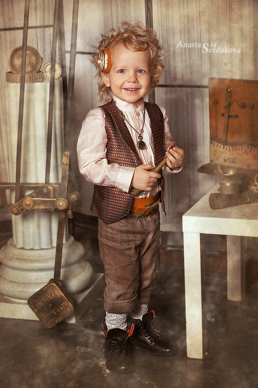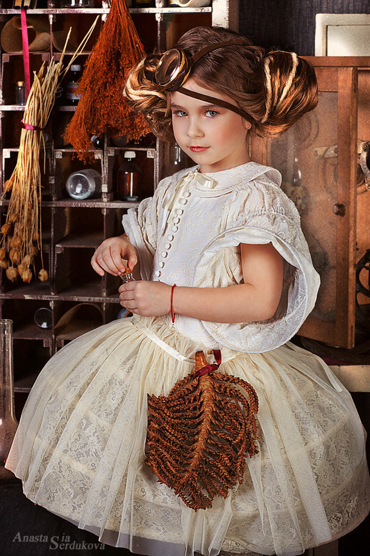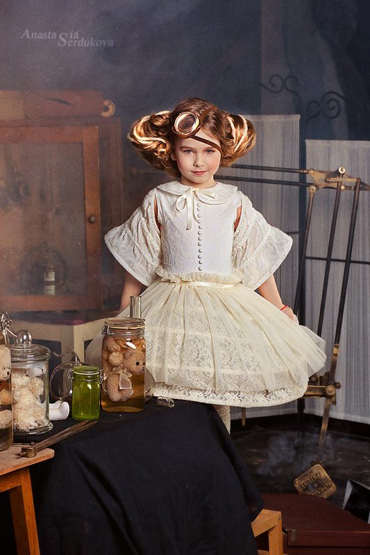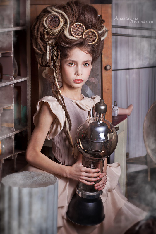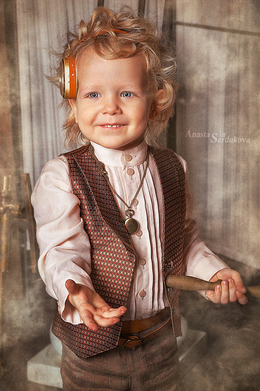 Мои волшебники: Модельер Зоя Гордеева Стиль и декорации Инна Спиридонова Отдельное спасибо за помощь в организации съемок и гостеприимство студии "Inspirata" и лично Виталию Гуляеву. И конечно же нашим потрясающим деткам, талантливым и артистичным) P.S. Стимпа?нк (или паропа?нк) — направление научной фантастики, моделирующее цивилизацию, в совершенстве освоившую механику и технологии паровых машин. Как правило, стимпанк подразумевает альтернативный вариант развития человечества с выраженной общей стилизацией под эпоху викторианской Англии (вторая половина XIX века) и эпоху раннего капитализма с характерным городским пейзажем и контрастным социальным расслоением. Возможно, однако, и наличие в произведениях стимпанка большей или меньшей доли элементов фэнтези. (буду рассказывать постепенно и в конце даже покажу вам небольшой бекстейджик)