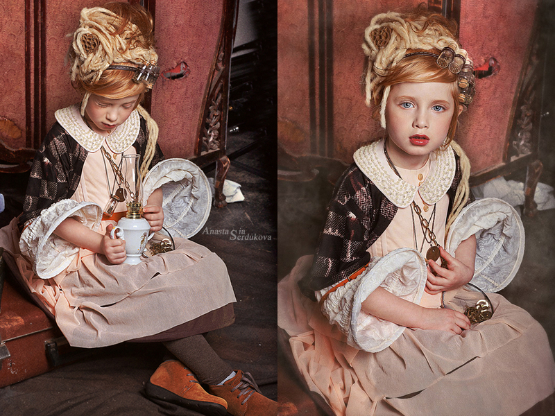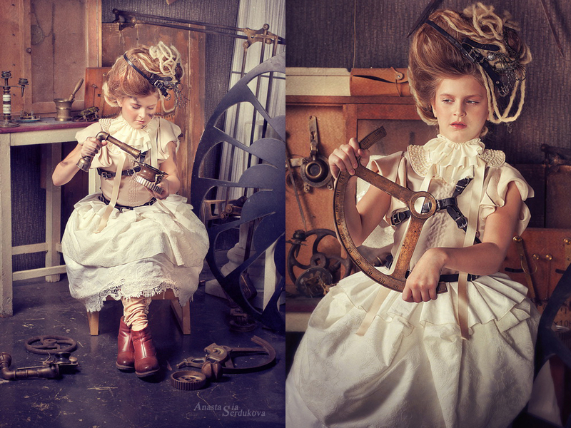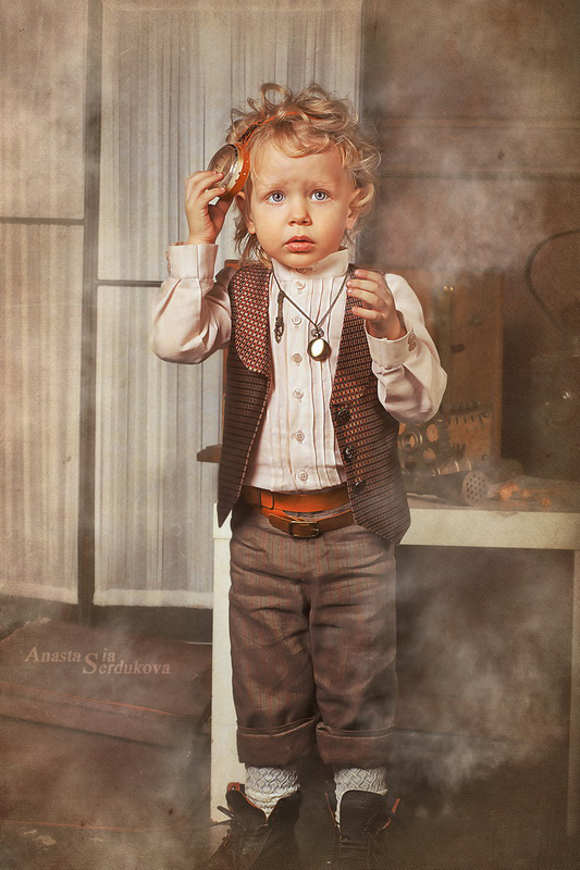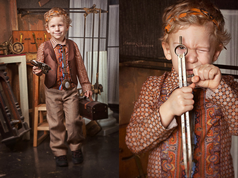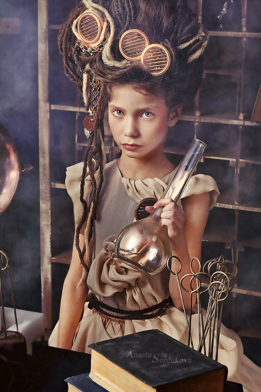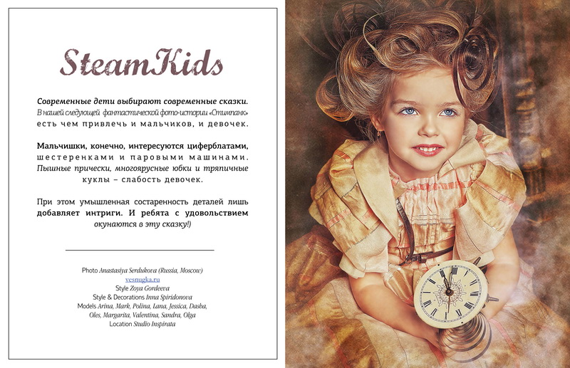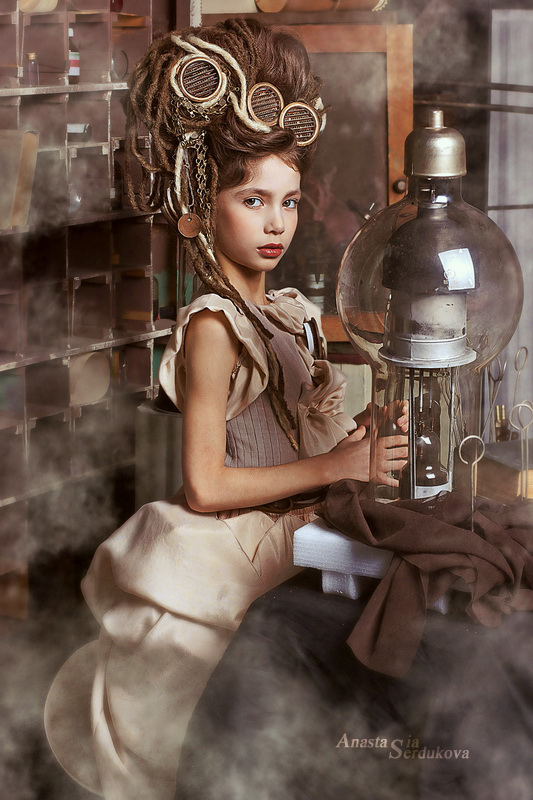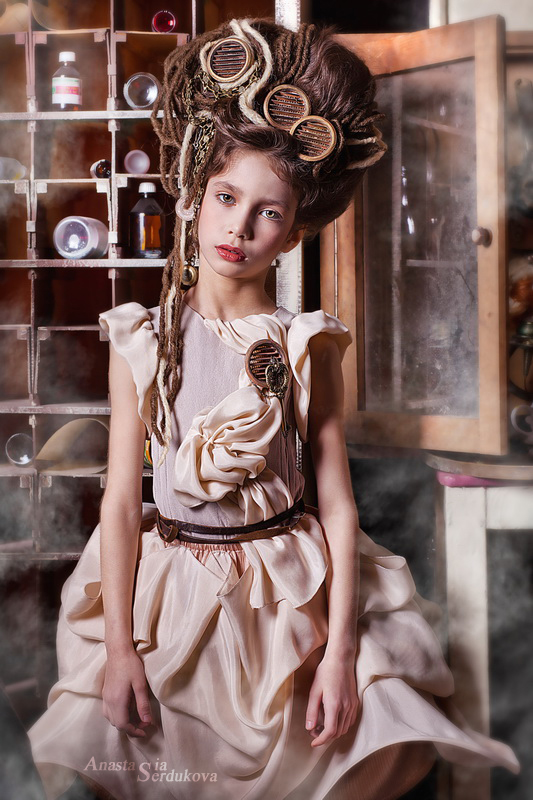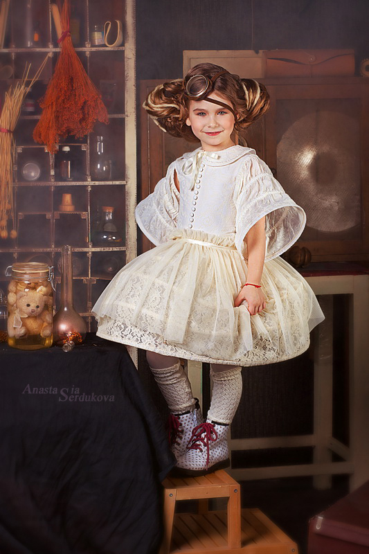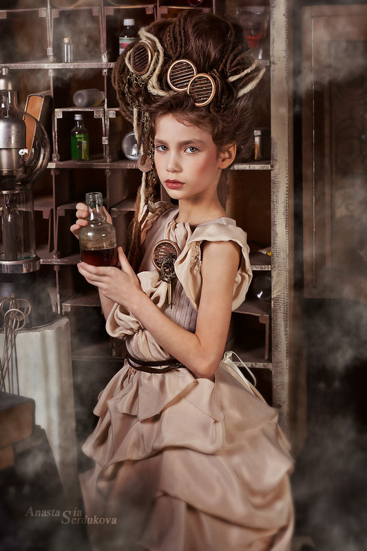 Мои волшебники: Модельер Зоя Гордеева Стиль и декорации Инна Спиридонова Отдельное спасибо за помощь в организации съемок и гостеприимство студии "Inspirata" и лично Виталию Гуляеву. И конечно же нашим потрясающим деткам, талантливым и артистичным) P.S. Стимпа?нк (или паропа?нк) — направление научной фантастики, моделирующее цивилизацию, в совершенстве освоившую механику и технологии паровых машин. Как правило, стимпанк подразумевает альтернативный вариант развития человечества с выраженной общей стилизацией под эпоху викторианской Англии (вторая половина XIX века) и эпоху раннего капитализма с характерным городским пейзажем и контрастным социальным расслоением. Возможно, однако, и наличие в произведениях стимпанка большей или меньшей доли элементов фэнтези. (буду рассказывать постепенно и в конце даже покажу вам небольшой бекстейджик)