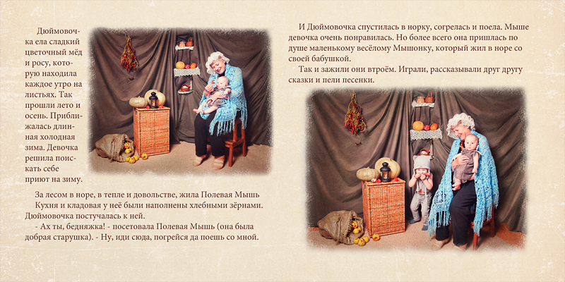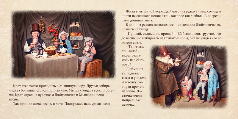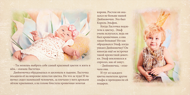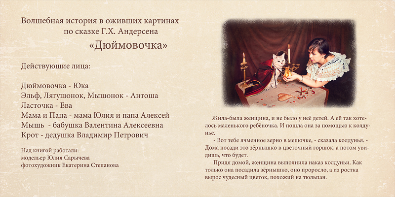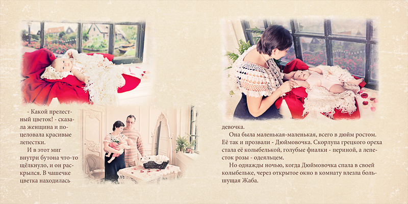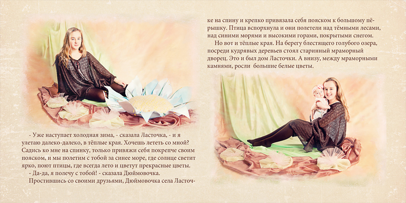 Семейный проект "Фотолирика" - это персональная срежиссированная фотосъёмка всего семейства по мотивам выбранной волшебной истории. Это и творческий семейный досуг, и возможность побывать в разных ролях, а ещё и получить настоящую семейную реликвию - фотокнигу, героями которой станут сами участники проекта. Представленная фотосъёмка проводилась по мотивам сказки "Дюймовочка". Я покажу сначала развороты книги и далее отдельные фотографии. Хочется верить, что смотреть будет интересно)