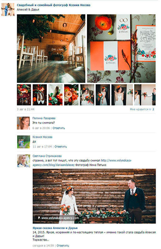 Я вообще не отслеживаю вашу группу, но ради интереса сейчас уже сходила посмотрела. И что я вижу, вы все же имели отношение к этому проекту, принимали непосредственное участие в нем (на скрине видно, что фото с проекта запостили вы, и клиенты вам говорят спасибо и т.п.). Не надо морочить голову всем, это был репост с чужими фото на вашу страницу с целью привлечения клиентов в проект.