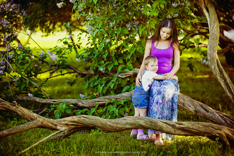 Наконец-то увидела цветущую сирень. И на фоне этой сирени маленькая Валерия с мамой.