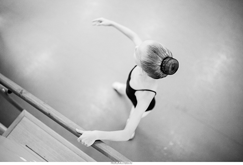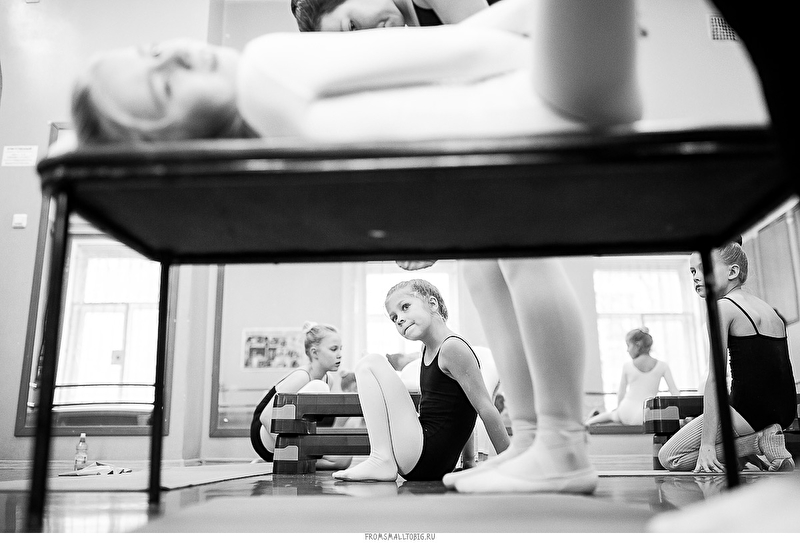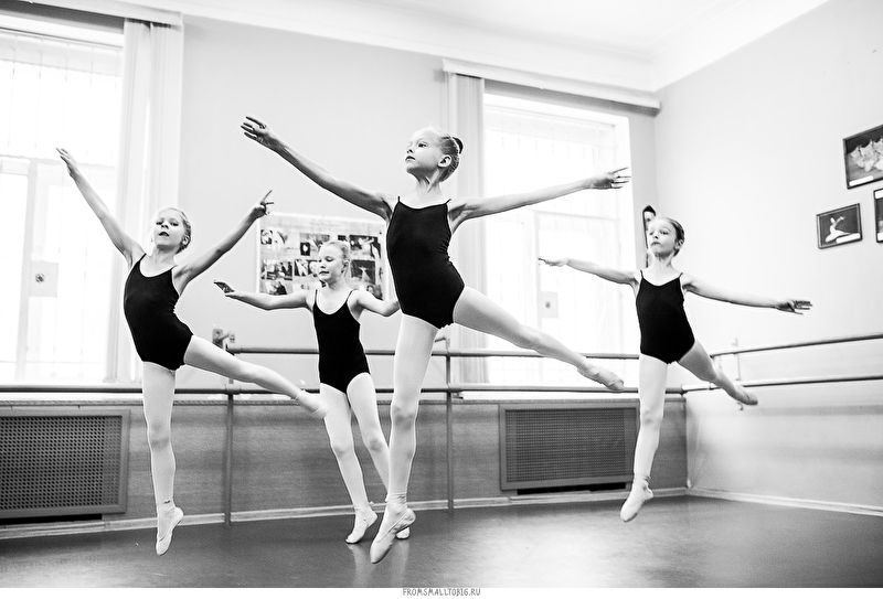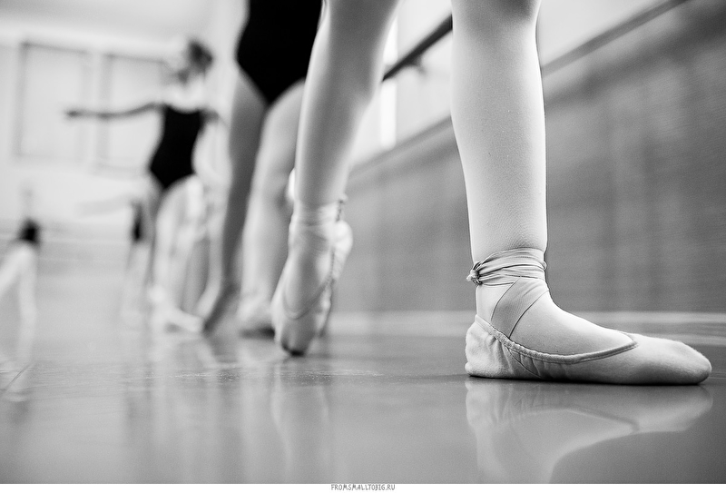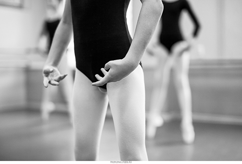 Обычный дом культуры в подмосковных Котельниках. Один их тех, что мало видоизменились с советских времен. Зеркальное полотно во всю стену, деревянный станок и старые журнальные фотографии Майи Плисецкой в качестве скромного декора. Ничего лишнего.