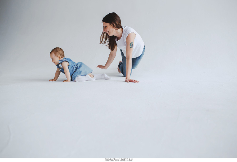 Очень любим белую циклораму , она как белый лист бумаги - рисуй, что хочешь! Рисовали вместе с Машей и ее родителями Аней и Максом. Общим составом с удовольствием ползали из угла в угол, случалось даже, что перебрались на потолок..