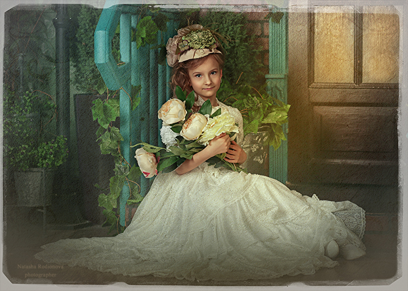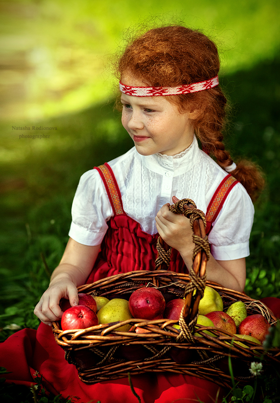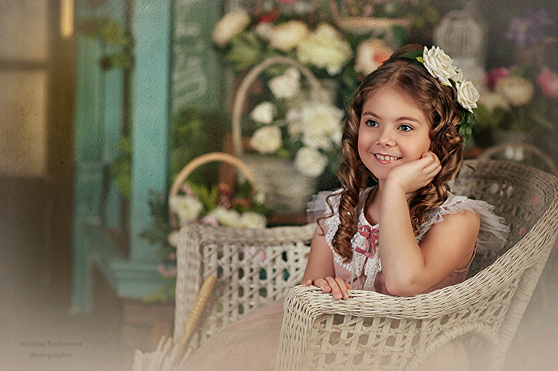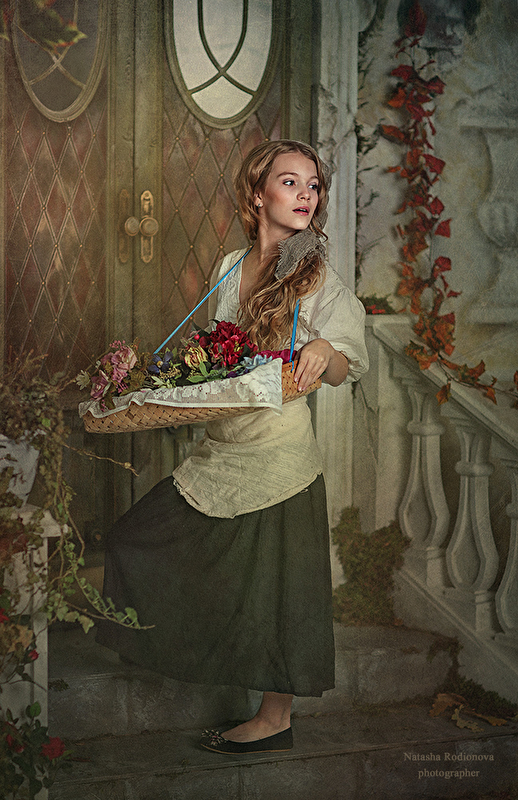 В маленьких ручках - с цветами корзина.
